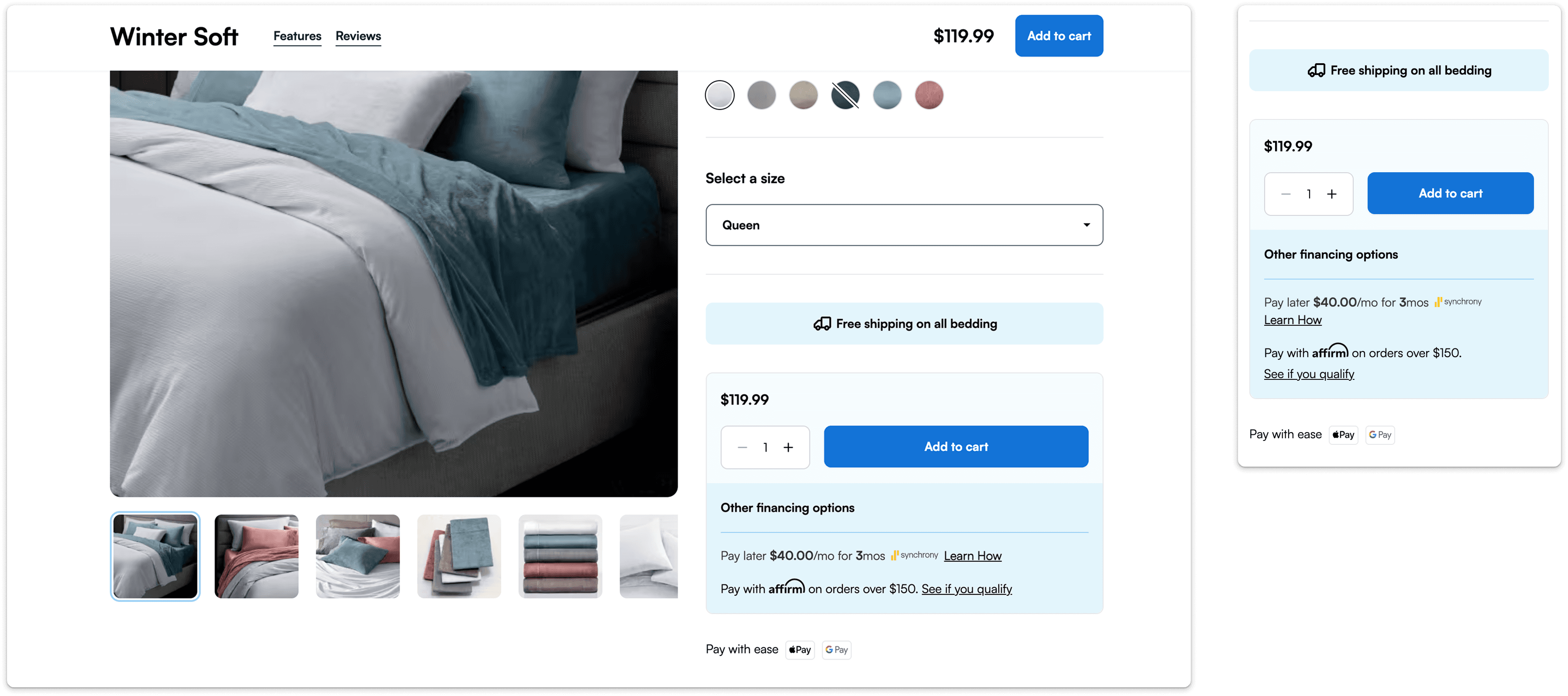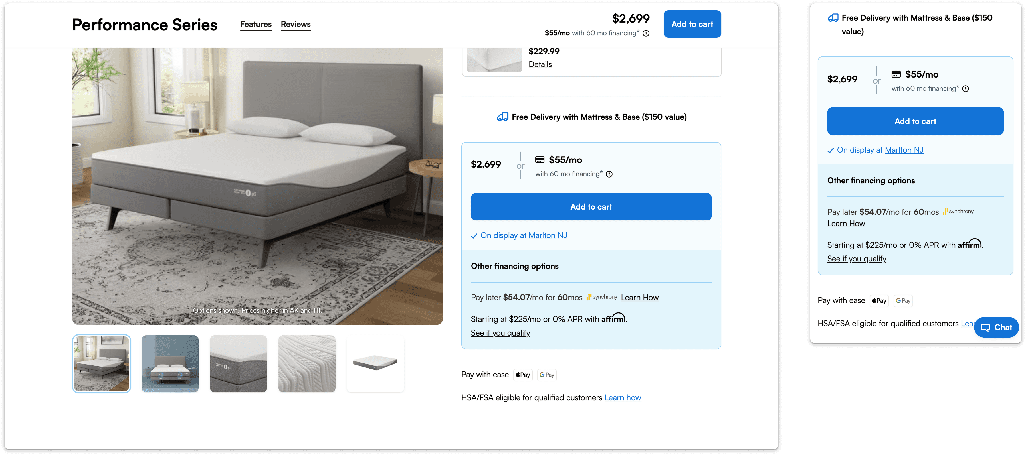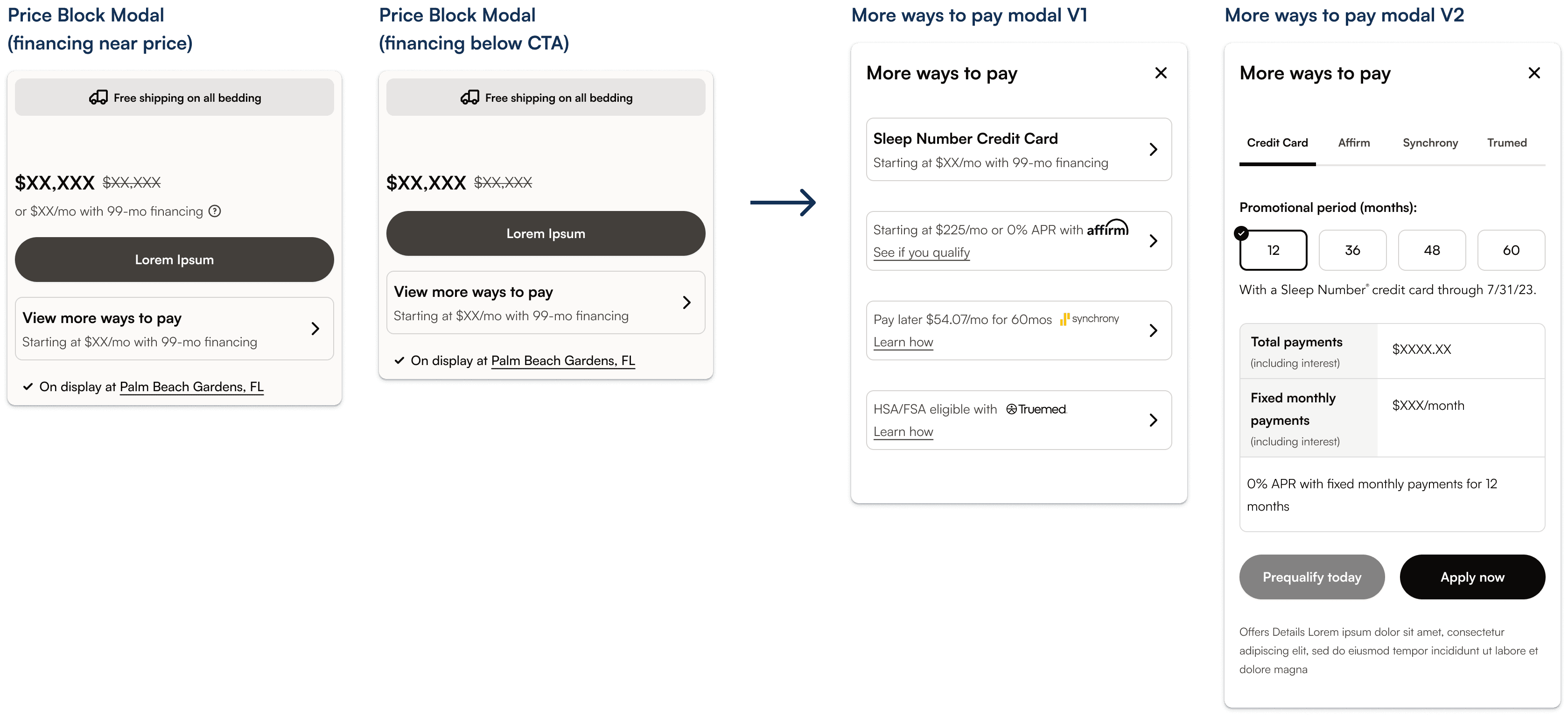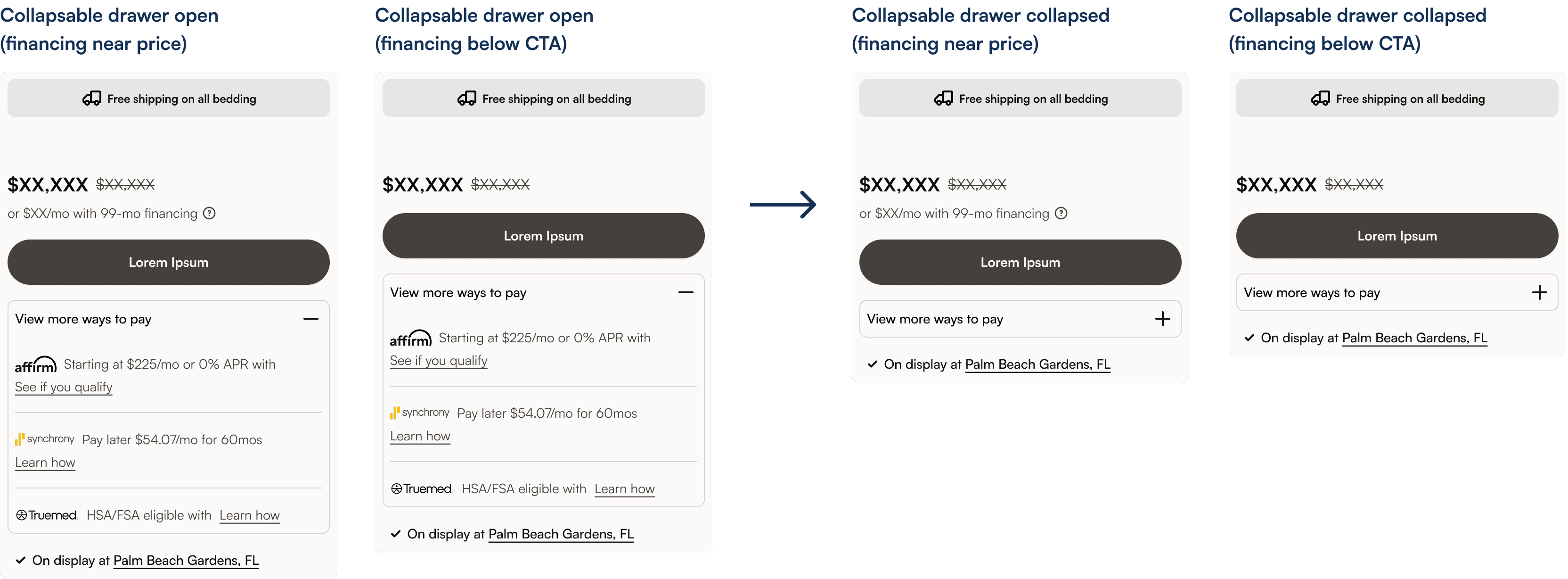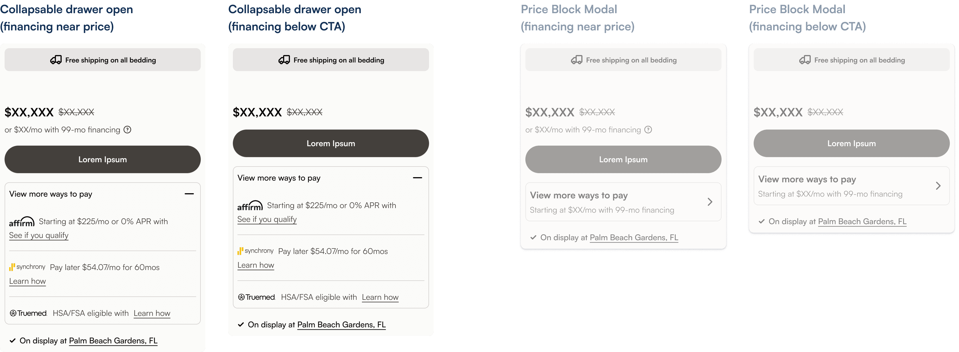 Based on discovery research, I explored placing the primary financing option with price vs. below the CTA, while testing ways to condense additional payment options through a modal or collapsible drawer.